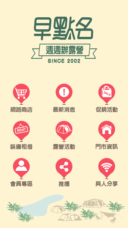 ‧ 優惠促銷訊息即時推播、網路平台線上購物、露營活動行程查詢等更便捷之優質服務回饋予廣大露友。