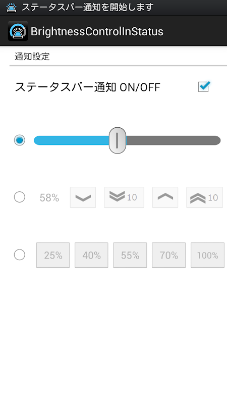 画面の明るさをステータスバー(通知領域)で変更することができるアプリです。