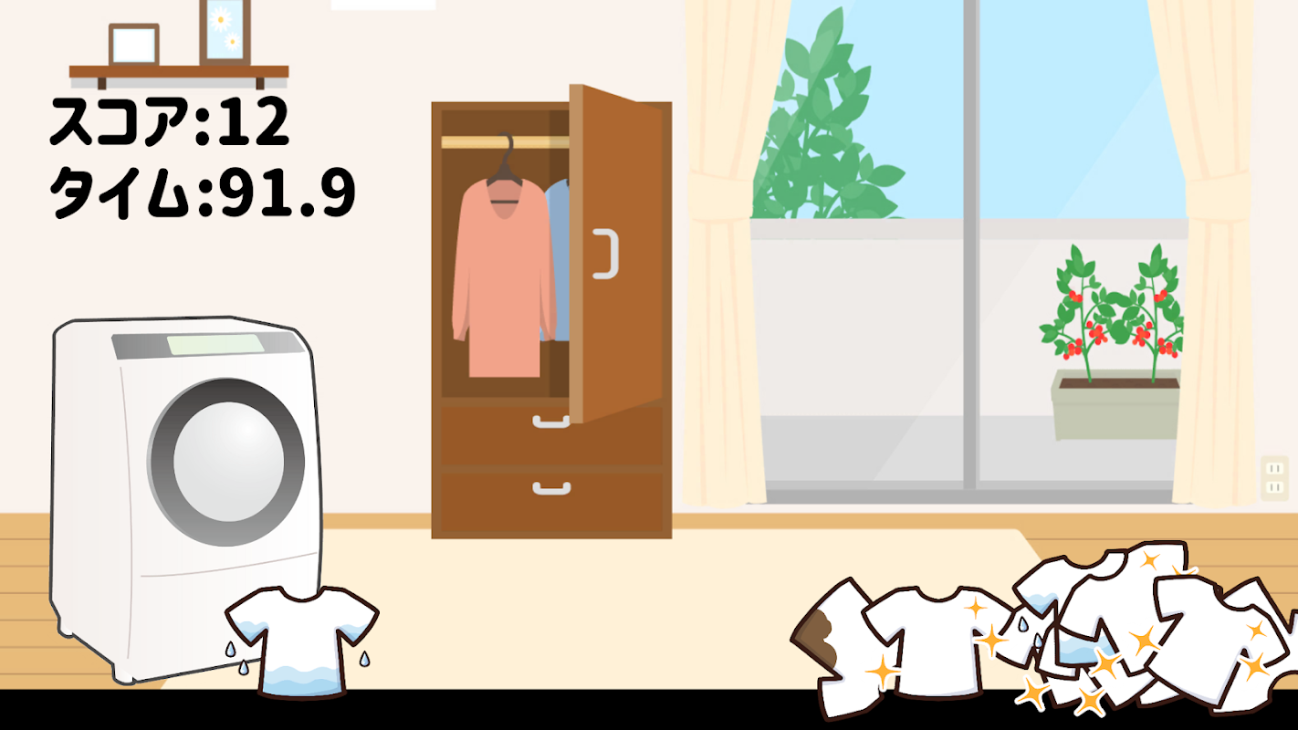「汚れた服を洗濯機に、濡れた服をベランダに、きれいな服をクローゼットに」それぞれ仕分けしていく簡単ゲーム!