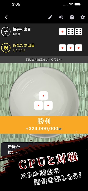 简单而现实的Chinchiro应用程序!搭载CPU战斗模式! * Chinchiro 专用应用程序 * 具有逼真的声音和动画的最大临场感