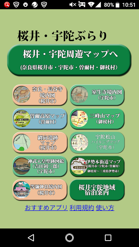 「桜井・宇陀ぶらり」は、桜井宇陀広域圏内(桜井市・宇陀市・曽爾村・御杖村)の広域観光情報・地図情報が表示される絵図や、古地図・イラストマップを、現在地図と見比べながら観光地を周遊できる観光周遊支援アプリです。