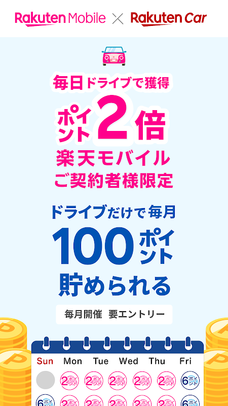 ・每月驾驶即可赚取超过 100 积分!:每天只需驾驶 2 公里或以上即可赚取乐天积分。连续行驶里程即可赚取奖励积分!