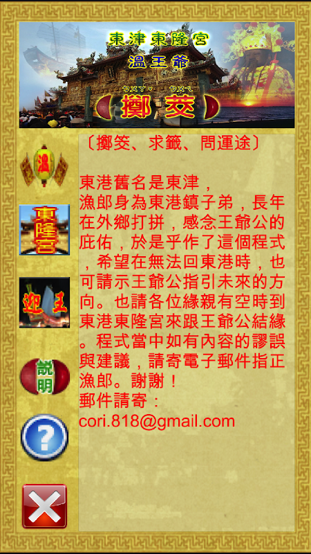 这是个让您可以遥向东港东隆宫温府千岁掷筊、求签、问运途的程式。