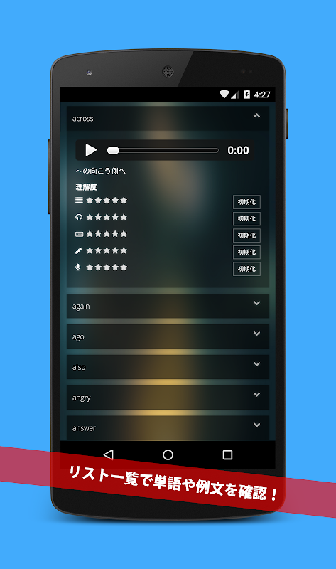「暗記モード」「四択クイズ」「リスニングクイズ」「ディクテーションクイズ」「ライティングクイズ」「スピーキングクイズ」の計六種類の方法で学習ができて、それぞれに「理解度」が記録されるため、効率よく学習が可能です。