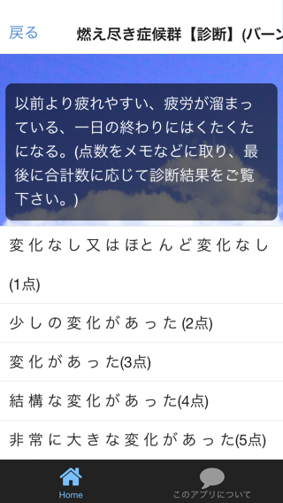 過 去 1 2 ヶ月のあなたの生活全体(仕事、社会との関わり、家族、休暇を含む)を見直して、この期間に起こった「変化」の度数を調べていき、質問に答え点数で今のあなたの状態を診断します。アプリ製作者も燃え尽き症候群で、現在カウンセリングを受けています。自分に正直に答え、また以前のような活発なあなたを取り戻して下さい。このアプリは少しでもそんなお手伝いができれば幸いです。