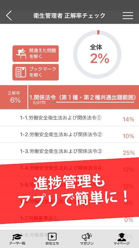 您可以在“我的页面”上管理您正在学习的内容。您可以查看“进度率”和“正确答案率”。您可以看到每个主题的进度率和正确答案率,让您对自己当前的能力和薄弱环节一目了然。您还可以仅提取您做错的问题或您添加书签的视频和问题,然后重试。