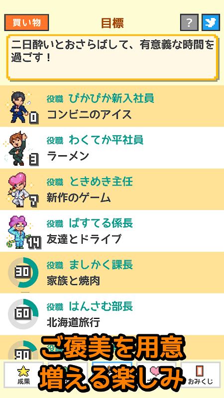 您是株式会社Shirafu的员工!像素艺术上班族将根据禁欲时间进行晋升。克服特比尔逼近的诱惑,向主席梦想迈进!