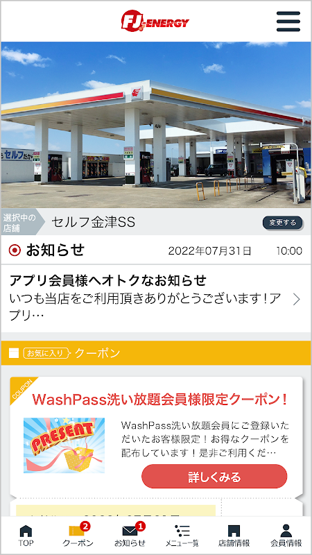 我们的官方应用程序“Fukui Energy”All-you-can-wash“”允许您使用洗车服务,并分发折扣券和可在我们商店使用的各种菜单的折扣信息。