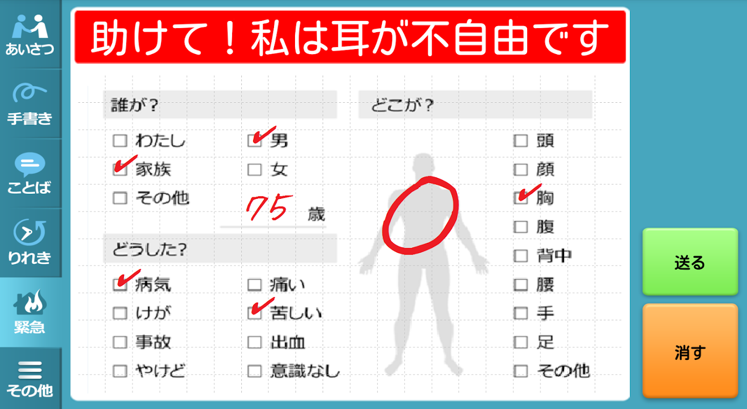 また、聴覚に障がいのあるかたは、救急車や消防車を自宅のFAXを使用して呼んでおり、外出先で救急車や消防車を呼ぶことが困難なことがあるそうです。緊急画面の手書き図に端末の位置情報を付加して予め登録したかたのメールアドレスに送信することで、外出先からでも助けを求めることができるようにしました。