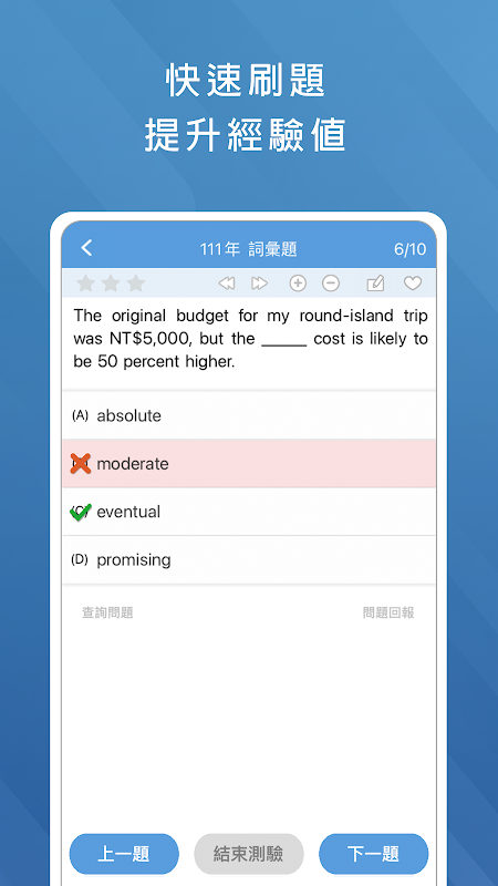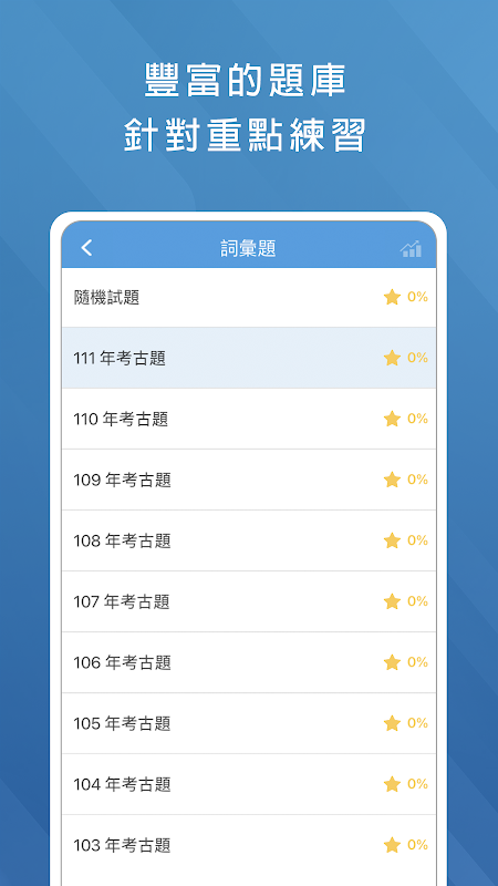 目前收录的题目有学测、指考、统测、二技、国中会考、高普考、导游领队人员考试,我们会再持续新增最新的题库。