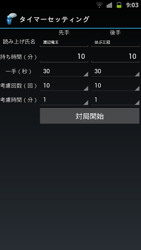 ・棋士名、持ち時間、1手時間、考慮回数、考慮時間が設定可