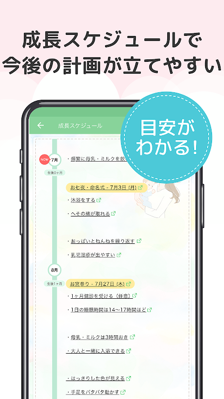 与月球年龄相匹配的信息每天都会到达!预防接种管理、婴儿食品食谱、配料表、成长时间表、睡眠和哭声等对照顾婴儿有用的育儿功能齐全!