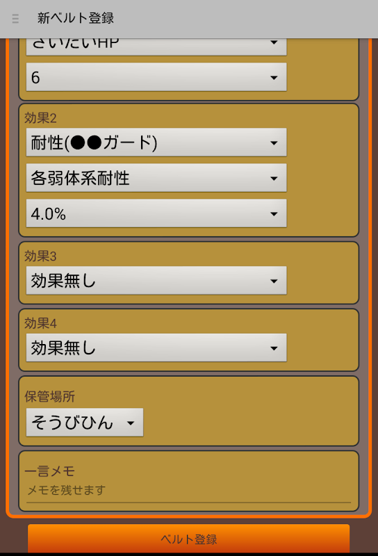 ・各効果の他に、「保管場所」の登録や「一言メモ」も残せます。