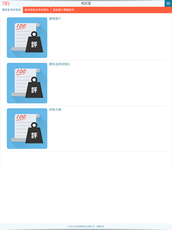 考試室:課程及考評資訊、樣本試卷及考評報告、星級獨立專題探究