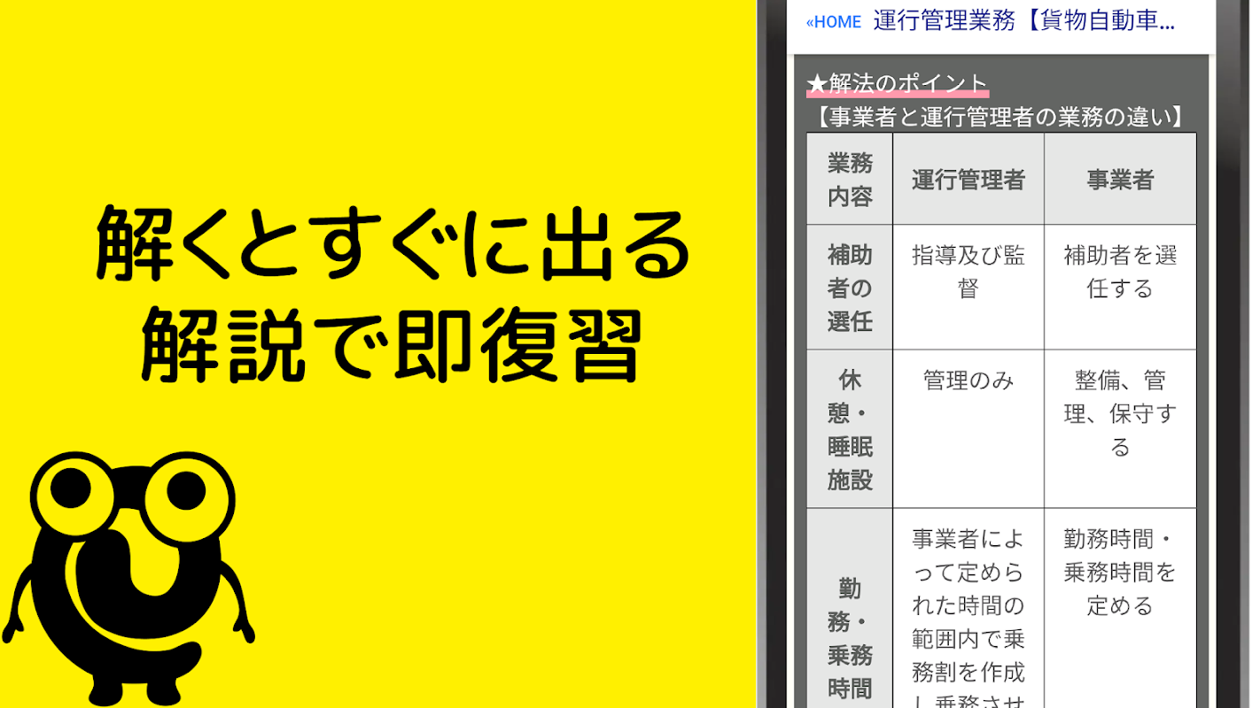 運行管理者(貨物)問題を隙間時間に解き、学習できるアプリケーションです。