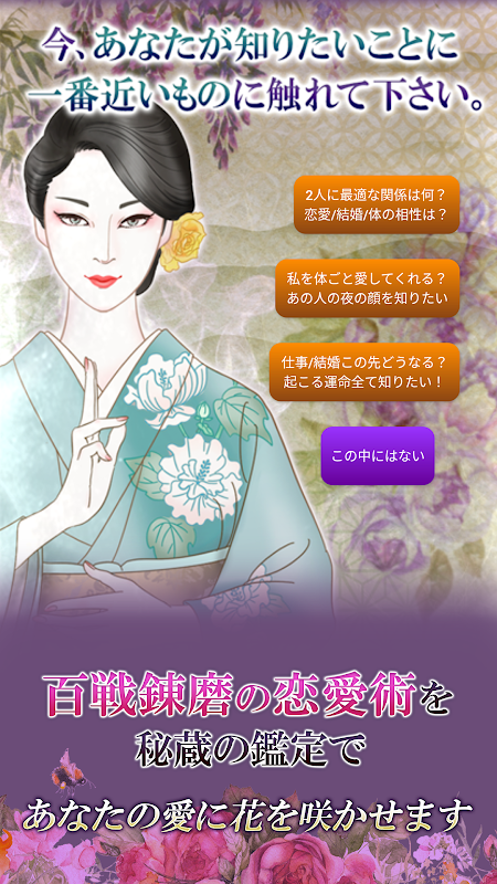 从大到小,生活不断受到挑战。答案不过是“获得幸福的答案”。算命是答案的指南。不同性格和运气的人,根据他们的出生日期和时间,会帮助你获得最好的幸福。作为银座某高级会所的女主人,我会加上我对人的成败、男女的浪漫、人际关系的光与影的凝视经验,给我自己的建议。