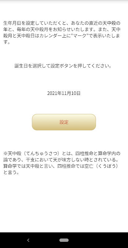 *2022年度版より、生年月日を設定していただくと、あなたの直近の天中殺の年と、毎年の天中殺月をお知らせいたします。また、天中殺月と天中殺日はカレンダー上にアイコンで表示いたします。
