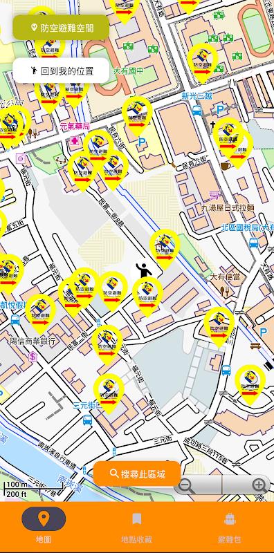 1. 附近AED、防空避难地点、医院诊所、超商超市、药局、公厕以及供水站地点搜寻后显示在地图上