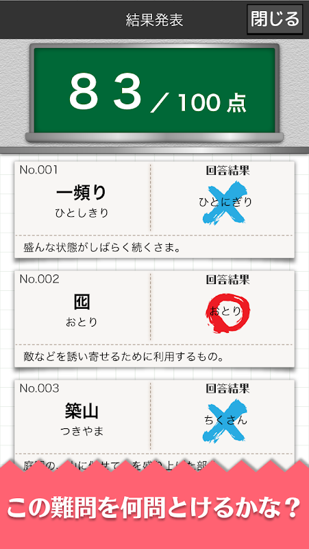 APKPure 使用签名验证功能,确保为您提供无病毒的 難読漢字クイズ-読めそうで読めない漢字- APK 下载。