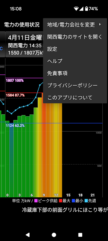 屏幕顶部显示日本气象厅提供的最新电力信息和天气信息,底部是电力信息的彩虹图显示。横屏上,一次性显示一周的时间。