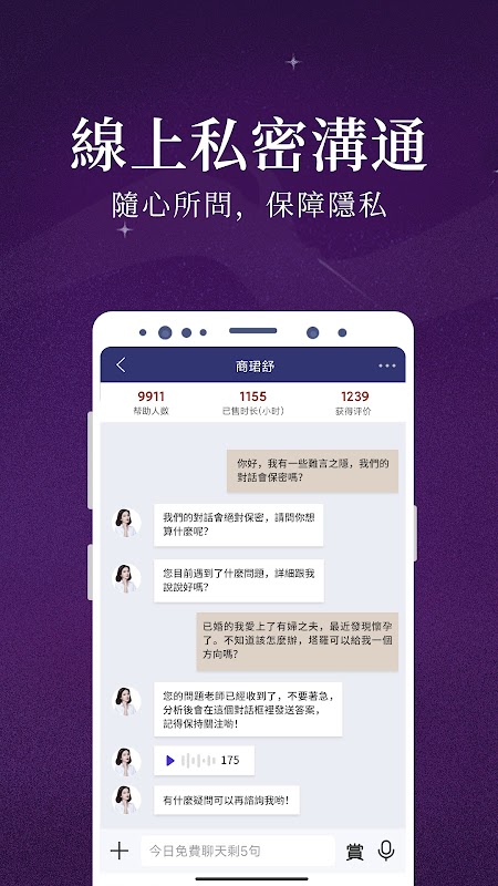 透过手机用程式,即时线上联络师傅,一键提出你的问题,命理师与你实时沟通,透过应用程式解答你心中的烦恼疑问, 进一步催吉避凶。线上算命服务的准确度,跟线下门店服务一样,并不会影响结果与建议。