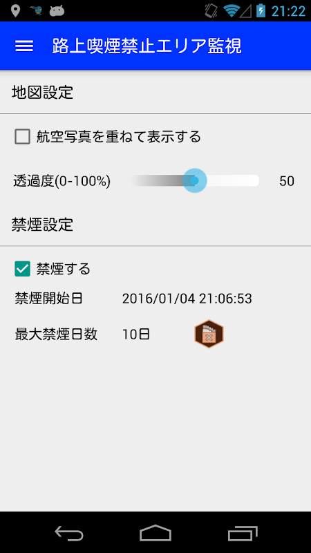 它是一个应用程序,用于监测和通知是否在大街禁烟静冈的区域中的当前位置。我们使用的是开放数据的静冈市的“街头吸烟禁令地图”。