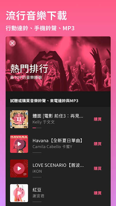 2.流行音乐下载(铃声、MP3): 音乐达人APP提供流行音乐排行,轻松享受各语系最TOP的达铃歌曲!可以选择完整的MP3全曲下载珍藏,也可以选择剪辑好的30秒手机铃声。