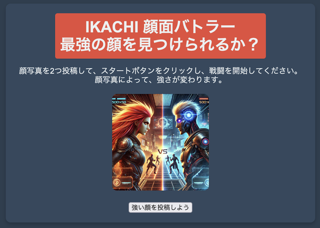 发布两张你的脸部照片,点击开始按钮,开始战斗。强度根据脸部照片而变化。