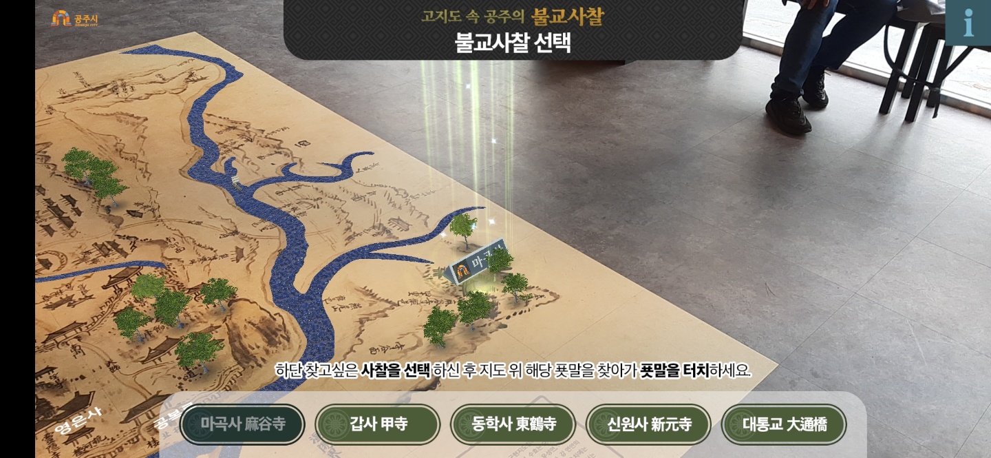 通过应用程序查看公州“济民川努里堂”的旧地图(1872年地方地图、公州木图),AR显示公州的佛寺信息。