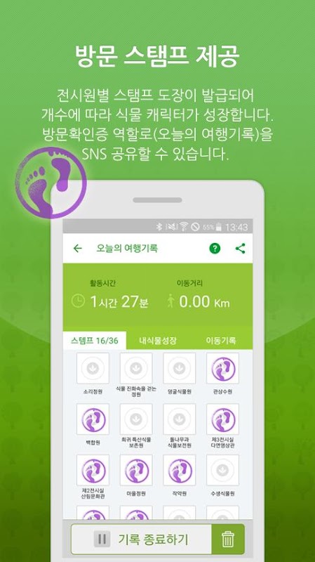 활동시간/ 이동 거리/ 내 식물 캐릭터/ 획득한 스탬프가 기록되며, 해당 기록을 방문확인증처럼 SNS에 공유할 수 있습니다.