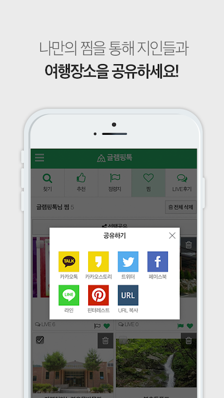 글램핑장, 맛집 , 관광지를 찜 목록에 담은 후 친구들과 전체 공유해서 상의하세요.