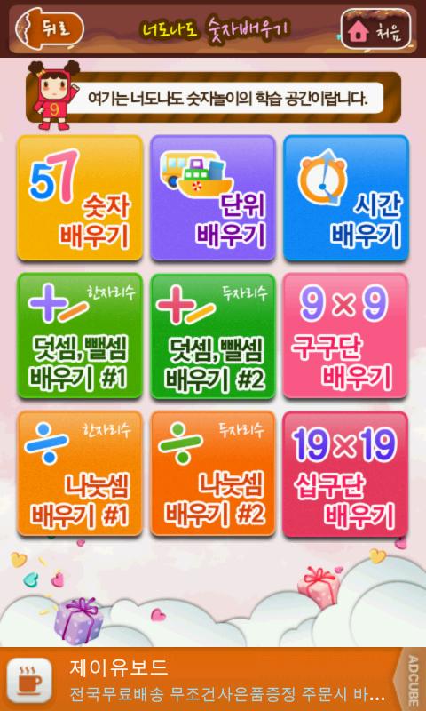 숫자배우기, 단위배우기, 시간배우기, 덧셈 뺄샘 배우기, 나눗셈 배우기, 구구단 배우기, 19단 배우기
