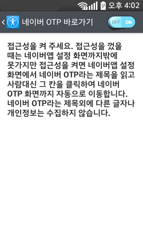 접근성 서비스를 추가로 사용하더라도 더 편하게 이용하고자 하는 사용자는 접근성을 켜 주세요. 이렇게 하면 네이버 OTP 바로가기 앱이 위 설정 화면에서 네이버 OTP라는 제목을 읽고 사람대신 그 칸을 클릭하여 네이버 OTP 화면까지 자동으로 이동합니다. 이 과정은 위 OTP란들 터치하는 과정도 불편해 하는 사용자를 위해 마련했습니다. 이 과정에서 네이버 OTP라는 제목외에 다른 글자나 개인정보는 수집하지 않습니다.