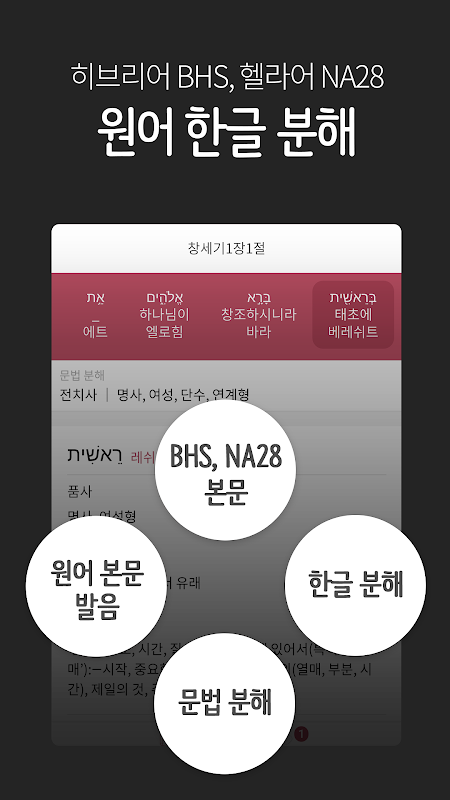 希伯来文旧约BHS(BIBLIA Hebraica Stuttgartensia,第五修订版,应用内购买),威斯敏斯特列宁格勒食品法典委员会(免费)一,希腊新站圣经NA28(雀巢奥兰,Novum酒店Testamentum Graece,第28修订版,在应用程序内购买) SBL希腊新约(免费)包括在内。特别是,BHS和NA28包括在原韩文分解(分解语法,圣经对比韩语,韩语毒)的特点是学习圣经和讲道的准备是非常有用的。
