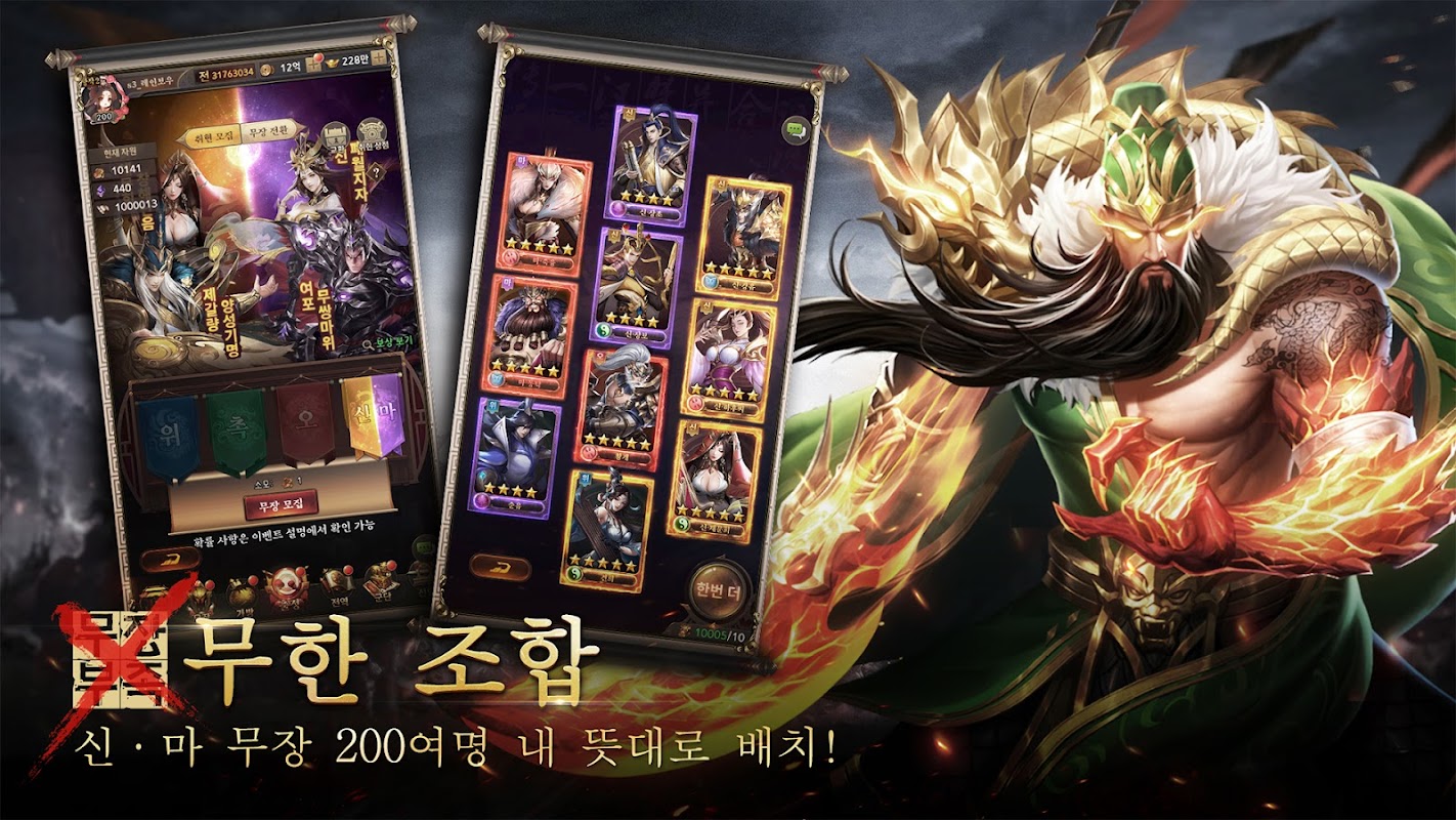 成为乱世之主,收集超过 200 名著名的三国武将。体验通过位置放置、部队兼容性和技能协同作用的智力战斗和近距离攻击策略!无需复杂的操作;只需轻轻一点手指,即可在这张地图上书写自己的三国史诗。