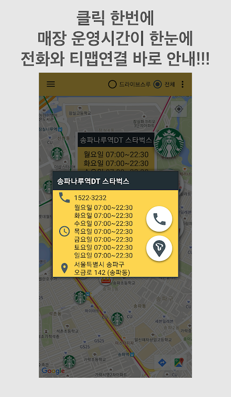 각 매장 별 운영시간도 클릭 한번에 바로 GO!!