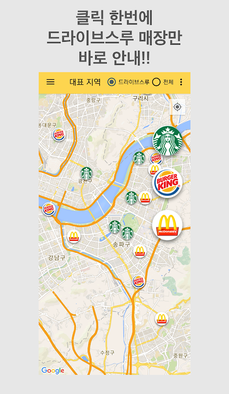 전국 스타벅스, 버거킹, 맥도날드 가장 가까운 드라이브스루 매장 클릭 한번에 바로 GO!