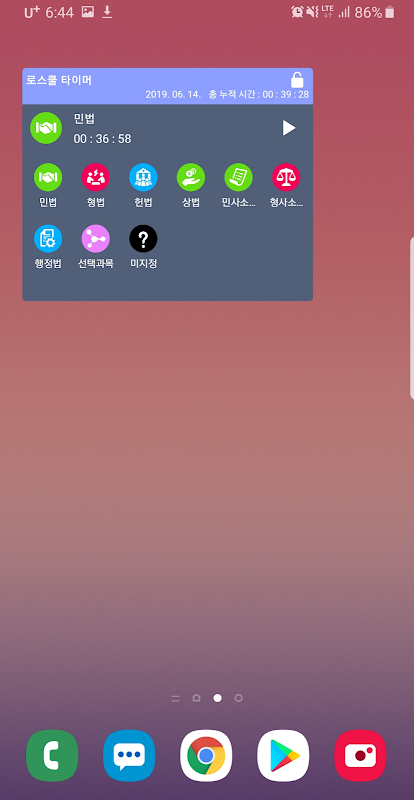 - 민법, 민사소송법, 상법, 형법, 형사소송법, 행정법, 헌법, 선택과목 등 8개의 과목을 구분해서 순공시간을 측정할 수 있습니다.