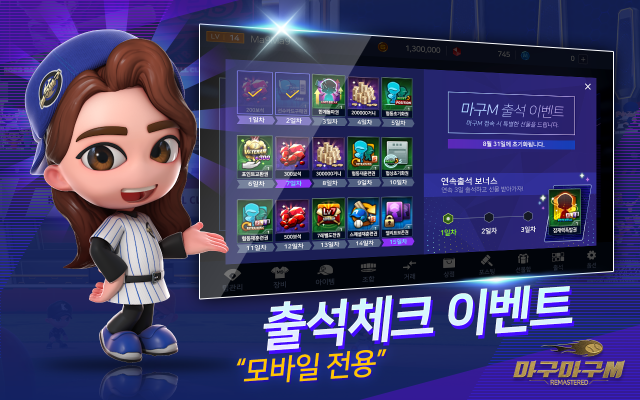 2. 마구마구M 리마스터로 접속하여 출석 보상을 받고 내 로스터를 성장 시키세요!