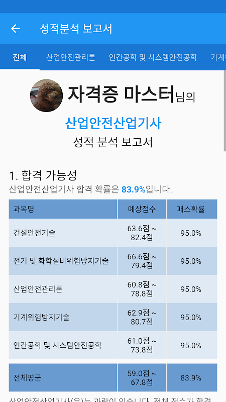 성적확인 - 각 과목별 성적 및 그동안 풀어본 기출문제와 모의고사, 문제풀기의 성적을 볼 수 있습니다.