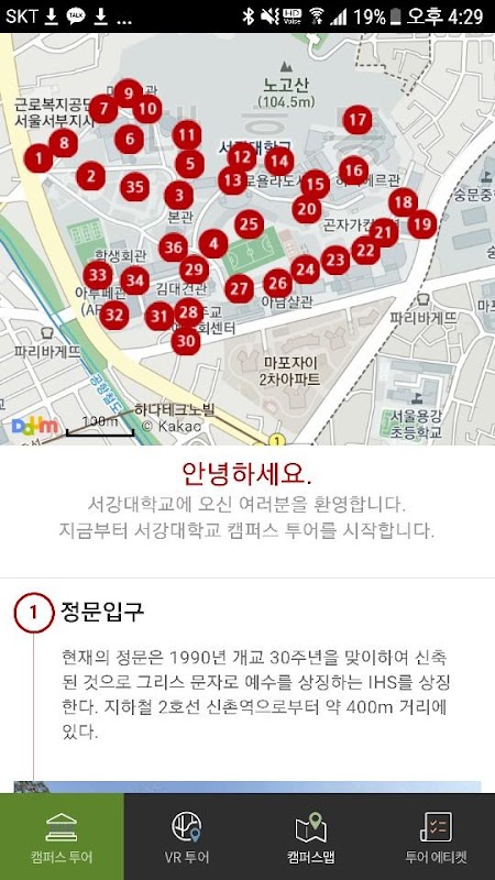 - 구글 지도와 연동하여 현재 위치에서의 본교 건물들에 대한 소개