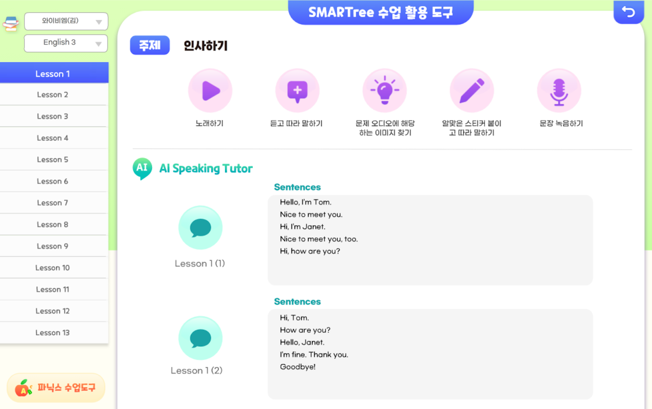 학생 개개인의 AI 스피킹 리포트를 확인하고 반별/학년 별 학습통계를 통해 좀 더 상세핵 학슜 피드백 제공