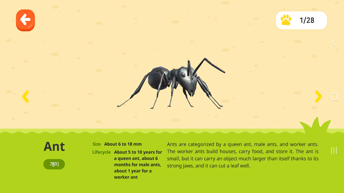 - 동식물의 증강현실을 360도로 관찰해보기도 하고 도감을 통해 해당 동식물에 대한 자세한 정보를 학습하며 아이의 탐구력을 키워줍니다.