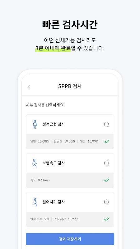 - 即使是耗时最长的简单身体功能 (SPPB) 测试,也可以在 3 分钟内完成。