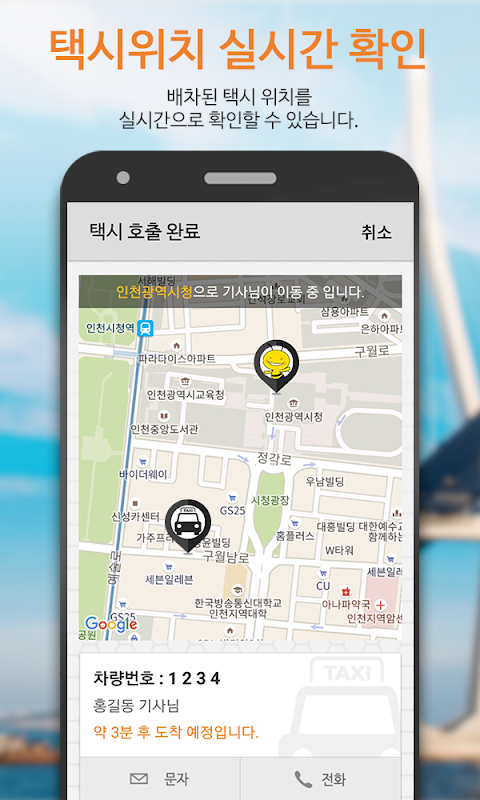 - 차량위치정보제공(배차후 손님위치까지 차량이동상황, 도착시간 제공)