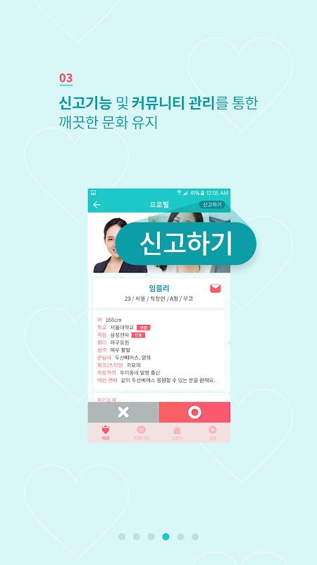 신고기능을 이용하여 깨끗한 소개팅 문화를 유지합니다.
