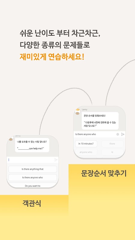 챗봇 라니는 다양한 난이도의 질문을 던지며 여러분이 열심히 배운 표현들을 완전히 익숙하게 사용할 수 있도록 도와줄거예요!