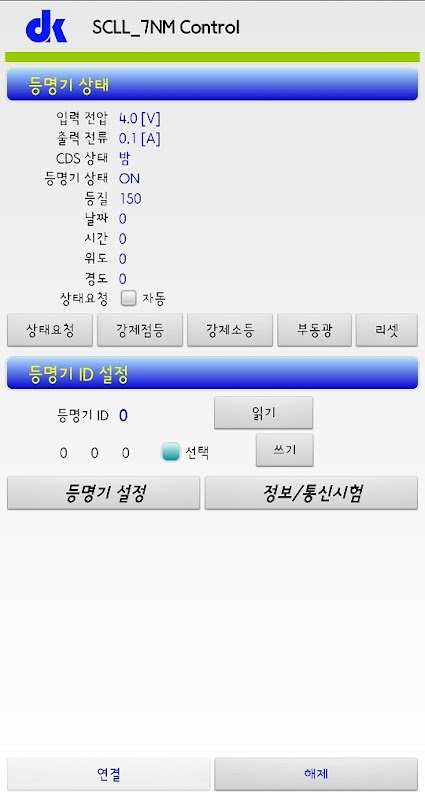 등명기 상태조회, 등명기 설정, 프로그램 정보 조회 및 통신시험을 할수 있습니다.