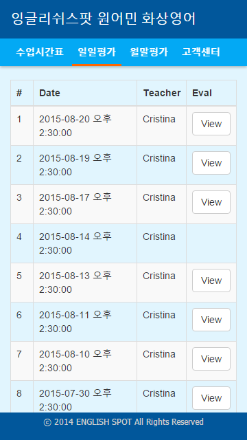 ESPOT 원어민 화상영어 어플리케이션은 ESPOT 학습 회원들의 스케쥴 및 학습 평가현황을 언제 어디서나 손쉽게 확인 할 수 있도록 구성이 되어 있습니다.