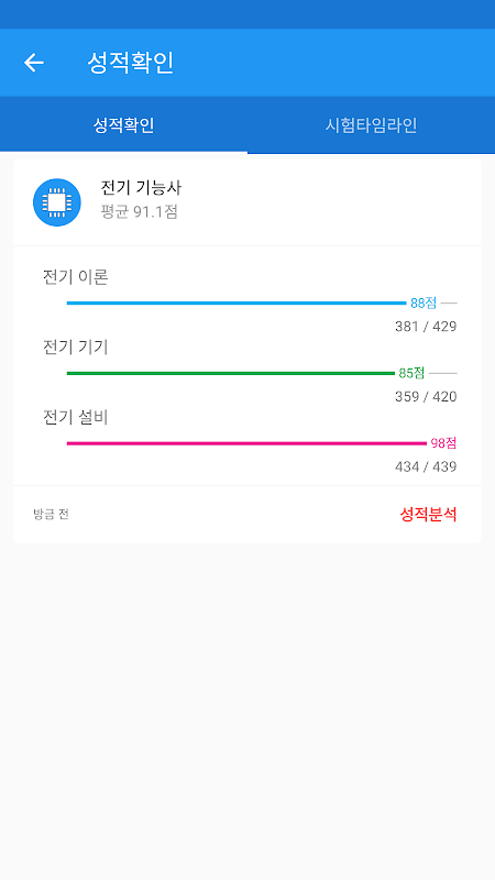 성적확인 - 각 과목별 성적 및 그동안 풀어본 기출문제와 모의고사, 문제풀기의 성적을 볼 수 있습니다.
